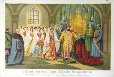 | Keywords: Bride-show-Abramov.jpg Brief description Tsar Alexey Mikhailovich choosing a wife Выбо невесты Ца я Алексея ихайловича Х омолитог афия А Аб амова 1882 source 1882 A Abramov PD-Art The Bride-show Alexis I of Russia in history paintings Files uploaded by Shakko from various sources |