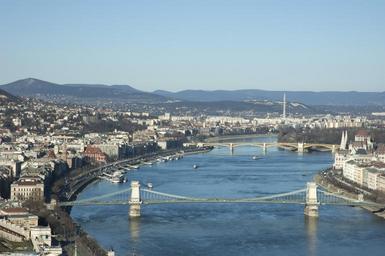Keywords: bridge buda pest budapest danube river cityscape hungary urban city town water old szechenyi building historical tourism view hill sight