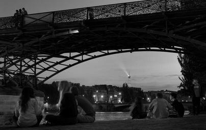 Keywords: bridge evening paris right bank pont des arts people socializing relaxing architecture dusk twilight scene urban gathering seine river france europe