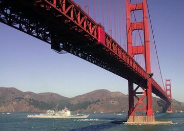Keywords: bridge golden gate landmark icon bay water suspension structure famous architecture attraction ship cruiser navy san francisco california usa