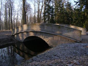 Keywords: bridge morning sky park trees dawn reflection water
