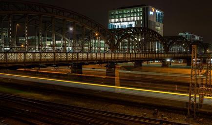 Keywords: bridge munich hacker bridge night railway station gleise train lighting mood gloomy express train old arrival