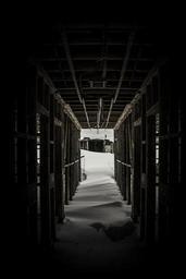 Keywords: bridge pier jetty wooden posts underneath winter snow perspective construction architecture structure building