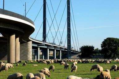 Keywords: bridge rheinbrücke suspension bridge rhine knee bridge düsseldorf sheep architecture technology stahlbau enormous strong steel construction building pylons large traffic road technology and nature