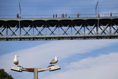 Keywords: bridge seagulls blue observe blue sky bird litoral tranquility