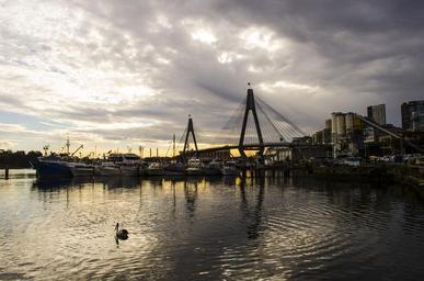 Keywords: bridge water pelican landmark scene sunset landscape sky