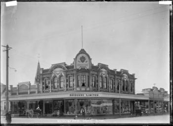 | Keywords: blackandwhite monochrome photo border outdoor building architecture black and white View of Bridgers Ltd (Drapery store) on the corner of Church Street and Main Street (now known as Elliot Street). The clothing, etc in the window displays, is clearly visible. A poster advertising the Art Union is on the window at the centre. A horse and cart are parked outside. A man and dog are standing on the footpath at the intersection. Photograph taken by William A Price in early 1900s. Quantity: 1 b&w original negative(s). Physical Description: Dry plate glass negative 4.5 x 6.5 inches Bridgers Ltd, Opotiki. Price, William Archer, 1866-1948 :Collection of post card negatives. Ref: 1/2-001106-G. Alexander Turnbull Library, Wellington, New Zealand. natlib.govt.nz/records/22720650 View of Bridgers Ltd (Drapery store) on the corner of Church Street and Main Street (now known as Elliot Street). The clothing, etc in the window displays, is clearly visible. A poster advertising the Art Union is on the window at the centre. A horse and cart are parked outside. A man and dog are standing on the footpath at the intersection. Photograph taken by William A Price in early 1900s. Quantity: 1 b&w original negative(s). Physical Description: Dry plate glass negative 4.5 x 6.5 inches Bridgers Ltd, Opotiki. Price, William Archer, 1866-1948 :Collection of post card negatives. Ref: 1/2-001106-G. Alexander Turnbull Library, Wellington, New Zealand. natlib.govt.nz/records/22720650 |