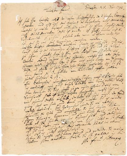 | Keywords: Brief Johann Christian Klengel 1792-11-08.jpg Brief Johann Christian Klengel an den Kunsthändler Friedrich Frauenholz in Nürnberg Dresden 8 November 1792 Ich hoffte immer auch die Rembrandts zu sehen glaube aber wenn es Ihnen möglich ist das Sie mir das Vergnügen machen werden Auf Ihre künftige auction freue ich mich sehr und vielleicht habe ich das Vergnügen künftiges Jahr Sie und sie selbst zu sehen Hierbey lege ich Ihnen einen Brief von H Rode aus Berlin dadurch erspare ich das Schreiben welches mir alle Jahr schwerer wird Zugleich lege ich Ihnen noch einige Noten von Campe bey und glaube ich habe ihnen schon lezthin geschrieben daß Sie für einen Freund die 3 Blätter von Ruisdael schiken sollen jedes höchstens 2 fl - Ein Exemplar von den römischen Sachen groß u klein habe ich verkauft wie auch beyde Blätter von Reinhardts Wald Aber denken Sie sich so gar meinen schönen Druk von Reinhardt habe ich auch müßen hingeben wofür ich mir einen schönen dafür ausbitte der aber ff sein muß Der Freund gieng fort von hier und konte nicht warten bis ich wieder welche bekäme http //www bassenge com/ 1792-11-08 Creator Johann Christian Klengel PD-old-100 Images from Galerie Bassenge Johann Christian Klengel 1792 letters |