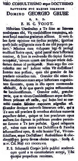 | Keywords: Brief von Friedrich Heinrich Voigt an Jürgen (Georg) Grube (Lateinisch).jpg de Brief von Friedrich Heinrich Voigt an Jürgen Georg Grube auf Lateinisch nochmals nachbearbeitet à bersetzung Seinen hochkundigen und hochgelehrten den meistzuverehrenden seiner Gönner Herrn Georg Grube grüßt herzlich F H C Voigt Die von dir hochgelehrter Mann kundig und gebildet geschriebene Geschichte Uetersens übersende ich dir zugleich verbunden mit bestem Dank Wenn du sie aber vielleicht später als gedacht erhältst mögest du mir bitte meine Nachlässigkeit verzeihen und mich mich rechtfertigen lassen Mit größter Lust habe ich dieses gebildete Werk das die Geschichte meiner Heimat enthält wieder und wieder gelesen und mag ich auch schon ziemlich häufig damit beschäftigt gewesen sein es aufzuschlagen so hielt mich doch immer wieder das Verlangen fest es von neuem durchzulesen Sollte mir denn zu verzeihen sein oder nicht Das möchte ich dich hochgelehrter Mann bitten zu beurteilen Einstweilen muss ich dir einfach zu deinem glänzenden Unterfangen gratulieren Ich gratuliere dir auch zu deiner soliden Bildung und deiner überaus großen Geschichtskenntnis die du bei der Erstellung dieses Werks eingesetzt hast und von der jede Seite tüchtigstes Zeugnis ablegt Ich gratuliere mir und ich gratuliere der Heimat die dich hochgelehrten und hochgebildeten Mann als ersten bekommen hat der es angegangen ist die Geburt dieses Ortes und Klosters erfolgreich darzustellen Ich gratuliere schließlich der ganzen akademischen Welt die von dir nur Hervorragendes und in jeder Hinsicht Vollständiges erwarten darf und mit vollstem Recht von dir fordert dieses hervorragende und seines Autors würdige Werk veröffentlichen zu lassen Was nun bleibt ich wünsche dir mit deiner ganz reizenden Freundin und deiner höchst geschätzten Familie alles Gute und bitte dich hochkundiger und hochgelehrter Mann mir der ich dir ganz zugetan und gehorsam bin inständig mir weiterhin gewogen zu bleiben P S Das Schmaussche Corpus iuris publici academicum das ich von dir leihweise erhalten habe will ich dir ebenfalls bald zurückschicken de eigene reproduktion das Original mehr als 100 Jahre alt en own reproduktion original is more than 100 years old Fotografie aus dem Buch Vermischte historisch-politische Nachrichten in Briefen von einigen merkwürdigen Gegenden der Herzogthümer Schleßwig und Hollstein ihrer natürlichen Geschichte und andern seltenen Alterthümern 1762 Johann Friedrich Camerer 1720-1792 Friedrich Heinrich Voigt 1725-1795 1747-04-17 50px PD-old-100 Historical Deeds of the Monastery Uetersen 1747 documents Deeds Documents of Uetersen 1747 texts |