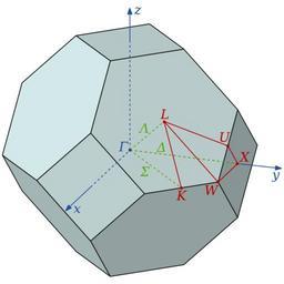 Keywords: Brillouin Zone (1st, FCC).svg A diagram of the first Brillouin zone of a face-centred cubic FCC lattice with pointsof high symmetry marked Own 2008-05-05 Inductiveload Brillouin zones Face-centered cubic lattices