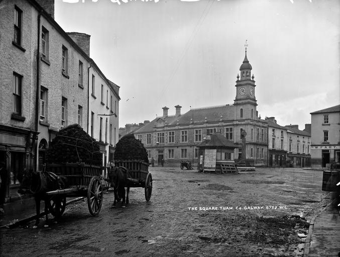 | Keywords: Bringing home the turf! (26972149122).jpg A topical subject even if the shot is over 100 years old Bringing in the turf for fires was an important source of fuel for most households and here are two fine loads in the Square in Tuam County Galway Somewhat ignoring the fossil fuel laden carts today's discussion focused on the posters we see - for the Ormonde family's Vivograph entertainments which we learned were a form of early cinema which visited towns around the country and http //earlycinema gla ac uk/advert/503/ indeed Scotland in the first years of the 20th century We also got some insight into the Tuam Town Hall pictured to the rear which was significantly https //www google ie/maps/ 53 514644 -8 8511765 3a 15y 240 64h 115 44t/data 3m7 1e1 3m5 1stVdlgvvc_KYepYOl511GYA 2e0 5s20090401T000000 7i13312 8i6656 6m1 1e1 hl en remodelled in the decades immediately before this picture We also learned about the now 900 year-old https //en wikipedia org/wiki/Tuam Tuam High Cross which was rebuilt and moved to the Square in the 19th century before being moved again out of the middle of the now roundabout in the 1990s Photographer Robert French Collection http //catalogue nli ie/Collection/vtls000313414 Lawrence Photograph Collection Date c 1880-1900 likely c 1900 based on date on poster and comments below NLI Ref http //catalogue nli ie/Record/vtls000041541 L_ROY_06759 You can also view this image and many thousands of others on the NLI ™s catalogue at http //catalogue nli ie catalogue nli ie https //www flickr com/photos/nlireland/26972149122/ Bringing home the turf https //www flickr com/people/47290943 N03 National Library of Ireland on The Commons http //www nli ie/en/flickr-commons aspx National Library of Ireland on The Commons Flickr Commons 53 514940 -8 851257 source Flickr Flickr-no known copyright restrictions PD-Old PD-1996 National Library of Ireland on The Commons https //flickr com/photos/47290943 N03/26972149122 2016-05-24 13 10 38 No known copyright restrictions County Galway Images from the National Library of Ireland Robert French Tuam Crosses Urban squares |