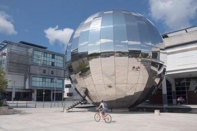Keywords: bristol planetarium millenium space glass aluminium mirror shiny metal reflection ball homes urban modern clouds sunny blue sky architecture art