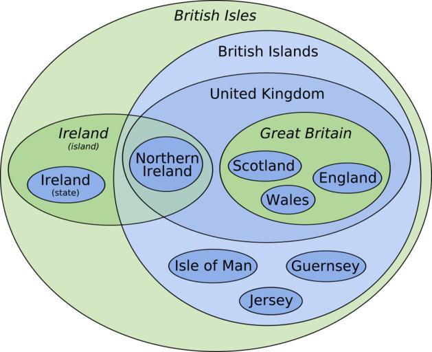 Keywords: British Isles Euler diagram 15.svg en Euler diagram of the British Isles aac2ed Legal distinctions b1d79b Geographical features 50px Consensus This diagram was developed by consensus Before modifying it please read the full discussion archive If you still want to change it please first discuss your proposed changes at the talk page on Wikipedia own TWCarlson Cc-zero Also Ireland state is more parallel with Ireland island so it shows the difference clearly ; Why is Northern Ireland included under British Islands when it is not an island British Islands confusingly is a legal term that includes the entire U K as well as Isle of Man and the Channel Islands See en British Islands ; British Isles is offensive and biased toward the United Kingdom It should say Great Britain and Ireland or These Islands There is controversy surrounding the use of this term and its use is being discussed at en WP BITASK If something new comes out of that conversation this diagram would certainly be subject to the new terminology ; Why does the legend use legal instead of political This is to cover terms like England and British Islands which were felt to be better described by the word legal because they don't have political or governing bodies ; England has no independent jurisdiction but is just the part of the U K that is not Scotland Wales or Northern Ireland; why is it on the diagram It is one of the four Constituent Countries It may not be an entity but it certainly has some sort of definition within the context of these constituent country divisions That's why the legend says legal distinction instead of legal entity ; The Crown Dependencies should be circled and labeled as such It was determined that this added clutter to an overview and also might imply that they are some kind of entity together when really they are three separate entities ; The Channel Islands are geographically a part of France not the British Isles This is an area where the difference between geographical and physical becomes apparent They are included by their historical and cultural links and because they are in proximity of Great Britain and Ireland even if they are physically closer to France Regardless all sources point to British Isles being a geographical term that includes the Channel Islands and it would be original research for the diagram to show something different See this other discussion for more detail ; Some parts of Scotland England and Wales are outside of Great Britain i e separate islands This is another instance of the blurry line between geographical and physical features The term Great Britain can refer to just the main island or it can refer to the combined territories of England Scotland and Wales including their smaller islands such as the Isle of Wight Anglesey Shetland and others It is in the latter sense that it is used here ; England and Wales should be shown as a legal distinction Technically yes but it was left out because this is an overview diagram Once terms like that were included there was much disagreement over what other legal or political relationships should also be included and it became too complex A political-only diagram was proposed for these kinds of details Subdivisions of the United Kingdom Membership diagrams
