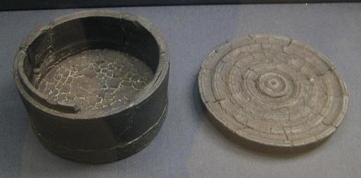 Keywords: British Museum Thetford Hoard shale pot.jpg en Shale pot from the Thetford Hoard own BabelStone 2010-08-21 Details Turned circular shale box with a raised lid-seating from the Thetford Hoard Height 53 mm box <br/>Height 14 mm lid <br/>Diameter 100 mm box <br/>Diameter 105 mm lid G49/dc23 cc-zero Thetford Hoard Pot lids