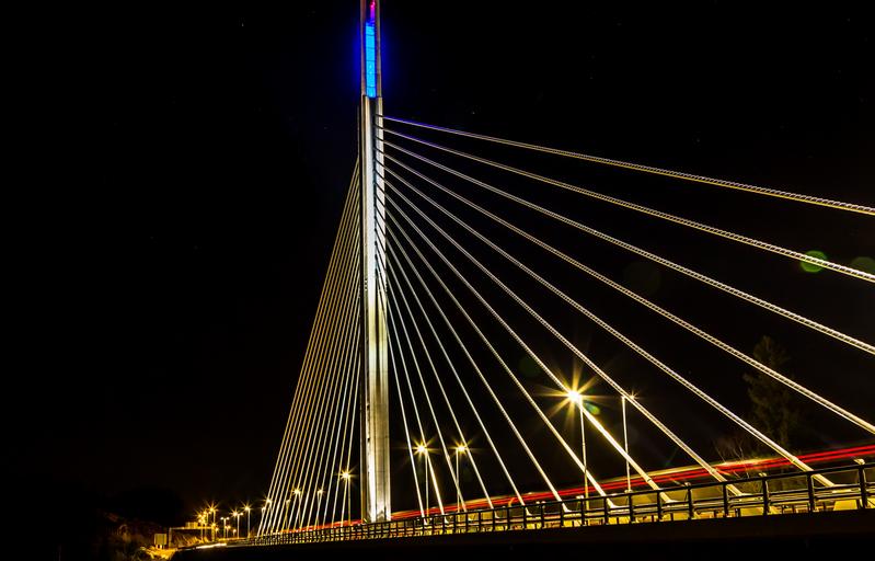 Keywords: bro natt lett belysningsutstyr blå lastebil landskapet himmel gate bil arkitektur og bygninger norge ledning rød stål lenge arkitektur langsom eksponeringstid