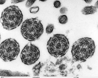 | Keywords: Bronchiolar area cilia cross-sections 1.jpg Transmission electron microscope image of a thin section cut through the bronchiolar area of lung mouse showing cilia cross-sections The inside of the cilium contain precisely arranged microtubles the axoneme The axoneme has a central unit containing two single microtubules and nine peripheral doublet microtubules known as the 9+2 Dynein sidearms project from the A tubule of each doublet JEOL 100CX TEM http //remf dartmouth edu/imagesindex html http //remf dartmouth edu/images/mammalianLungTEM/source/15 html Louisa Howard Michael Binder PD Louisa Howard and Michael Binder Cell biology |