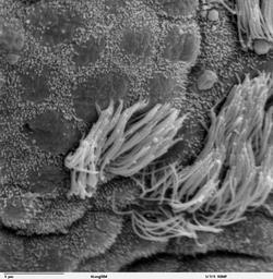 | Keywords: Bronchiolar epithelium 1 - SEM.jpg Scanning electron microscope image of bronchiolar epithelium which consists of ciliated and non-ciliated bronchiolar cells Note the difference in size between the cilia and the microvilla on non-ciliated cell surface Zeiss DSM 962 SEM http //remf dartmouth edu/imagesindex html http //remf dartmouth edu/images/mammalianLungSEM/source/6 html Louisa Howard Charles Daghlian PD Louisa Howard and Charles Daghlian Cell biology Epithelium Scanning electron microscopic images |