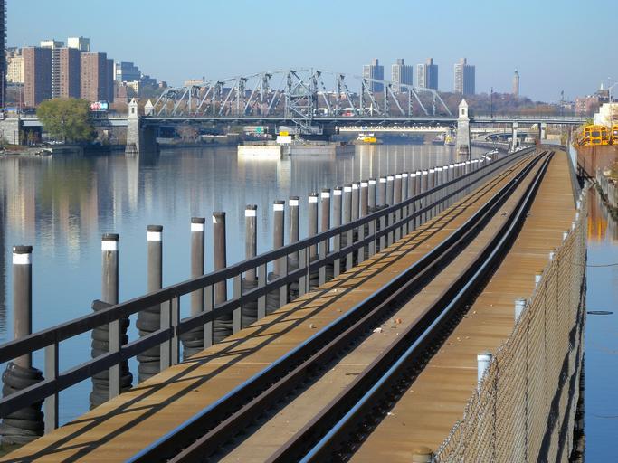 Keywords: bronx new york city railroad railway tracks river water reflections buildings city cities urban outside bridge architecture
