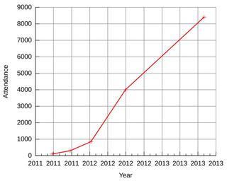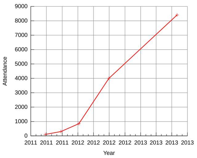 | Keywords: BronyCon-Attendance.svg alert me and I'll be happy to update this graph The file cmd contained the following set terminal svg fname Arial fsize 14 set ylabel Attendance set xlabel Year set datafile missing 'NA' unset key set grid back lw 1 set border 3 set ytics nomirror set xtics nomirror set xdata time set timefmt Y- m- d set format x Y plot \ data csv using 1 2 with linespoints lw 2 The file data csv contained Dates are the start date Dates and attendance are as reported in the English Wikipedia article BronyCon Date Attend 2011-06-25 100 2011-09-24 300 2012-01-07 850 2012-06-30 4000 2013-08-02 8407 The output was created with the command gnuplot < cmd > out svg 2012-06-28 own Alan De Smet I Alan De Smet disclaim any copyright on this image It is a mechanical creation by gnuplot with negligible creative input The data itself cannot be copyrighted cc-zero Uploaded with UploadWizard BronyCon |