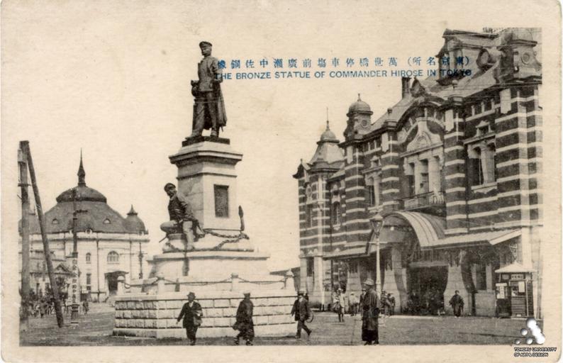 | Keywords: Bronze Statue of Commander of Hirose in Tokyo.jpg en The Bronze Statue of Commander Hirose Takeo in Manseibashi Station in Tokyo ja 京名 萬世橋 車場前廣 中佐銅像 between 1912 1923 before 1945 <br/>Note Manseibashi Station was opened in 1912 as brick building however it was destroyed in 1923 by 1923 Great Kantō earthquake Great Kantō earthquake http //www tobunken-archives jp/DigitalArchives/Image jsp lang en id 4B1B9EC4-D90A-6469-26E8-2E742E427301 title EF BC 88 E6 9D B1 E4 BA AC E5 90 8D E6 89 80 EF BC 89 E4 B8 87 E4 B8 96 E6 A9 8B E5 81 9C E8 BB 8A E5 A0 B4 E5 89 8D E5 BA 83 E7 80 AC E4 B8 AD E4 BD 90 E9 8A 85 E5 83 8F Tohoku University of Art and Design author PD-Japan-oldphoto Uploaded with UploadWizard Manseibashi Station History of Tokyo Postcards of Tokyo Statues in Tokyo Takeo Hirose Sugino Magoshichi 1912 in Akihabara Akihabara in the 1920s 1923 in Akihabara |