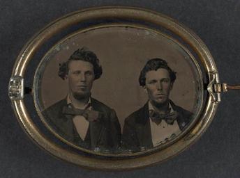 | Keywords: library of congress libraryofcongress dc:identifier=http://hdl.loc.gov/loc.pnp/ppmsca.27505 dc:identifier=httphdllocgovlocpnpppmsca27505 xmlns:dc=http://purl.org/dc/elements/1.1/ xmlns:dc=httppurlorgdcelements11 u.s. civil war uscivilwar american civil war americancivilwar the civil war thecivilwar civil war civilwar war between the states warbetweenthestates united states of america unitedstatesofamerica u.s.a. usa the union theunion union the north thenorth yankee yankees soldier soldiers brothers george w. detrick georgewdetrick george detrick georgedetrick detrick samuel detrick samueldetrick detrick brothers detrickbrothers 63rd pennsylvania infantry regiment 63rdpennsylvaniainfantryregiment jewellery jewelry groupshot people indoor round circle [Brothers Private George W. Detrick of Company F, 23rd Ohio Infantry Regiment and Private Samuel Detrick of Company A, 63rd Pennsylvania Infantry Regiment in a brooch] [between 1861 and 1865] 1 photograph : oval sixteenth-plate tintype, hand-colored ; 3.8 x 4.9 cm (case) Notes: Title devised by Library staff. Case: Oval metal swivel brooch; two hearts with an arrow. Inscription on box: This pin was given to grandmother Ann Kepner Detrick by grandfather, Samuel Detrick when he and his brother George enlisted in Civil War in 1862. Uncle George was killed. Right is grandfather, left is Geo. Additional information in collections file; records show date of enlistments as 1861. Gift; Tom Liljenquist; 2010; (DLC/PP-2010:105). Purchased from: The Horse Soldier, Cashtown, Pennsylvania, 2006. Subjects: Detrick, George W.,--d. 1862. Detrick, Samuel. United States.--Army.--Ohio Infantry Regiment, 23rd (1861-1865)--People. United States.--Army.--Pennsylvania Infantry Regiment, 63rd (1861-1864)--People. Soldiers--Union--1860-1870. Military uniforms--Union--1860-1870. United States--History--Civil War, 1861-1865--Military personnel--Union. Format: Brooches--1860-1870. Group portraits--1860-1870. Portrait photographs--1860-1870. Tintypes--Hand-colored--1860-1870. Rights Info: No known restrictions on publication. Repository: Library of Congress, Prints and Photographs Division, Washington, D.C. 20540 USA, hdl.loc.gov/loc.pnp/pp.print Part Of: Ambrotype/Tintype filing series (Library of Congress) (DLC) 2010650518 Liljenquist Family collection (Library of Congress) (DLC) 2010650519 More information about this collection is available at hdl.loc.gov/loc.pnp/pp.lilj Persistent URL: hdl.loc.gov/loc.pnp/ppmsca.27505 Call Number: AMB/TIN no. 2622 [Brothers Private George W. Detrick of Company F, 23rd Ohio Infantry Regiment and Private Samuel Detrick of Company A, 63rd Pennsylvania Infantry Regiment in a brooch] [between 1861 and 1865] 1 photograph : oval sixteenth-plate tintype, hand-colored ; 3.8 x 4.9 cm (case) Notes: Title devised by Library staff. Case: Oval metal swivel brooch; two hearts with an arrow. Inscription on box: This pin was given to grandmother Ann Kepner Detrick by grandfather, Samuel Detrick when he and his brother George enlisted in Civil War in 1862. Uncle George was killed. Right is grandfather, left is Geo. Additional information in collections file; records show date of enlistments as 1861. Gift; Tom Liljenquist; 2010; (DLC/PP-2010:105). Purchased from: The Horse Soldier, Cashtown, Pennsylvania, 2006. Subjects: Detrick, George W.,--d. 1862. Detrick, Samuel. United States.--Army.--Ohio Infantry Regiment, 23rd (1861-1865)--People. United States.--Army.--Pennsylvania Infantry Regiment, 63rd (1861-1864)--People. Soldiers--Union--1860-1870. Military uniforms--Union--1860-1870. United States--History--Civil War, 1861-1865--Military personnel--Union. Format: Brooches--1860-1870. Group portraits--1860-1870. Portrait photographs--1860-1870. Tintypes--Hand-colored--1860-1870. Rights Info: No known restrictions on publication. Repository: Library of Congress, Prints and Photographs Division, Washington, D.C. 20540 USA, hdl.loc.gov/loc.pnp/pp.print Part Of: Ambrotype/Tintype filing series (Library of Congress) (DLC) 2010650518 Liljenquist Family collection (Library of Congress) (DLC) 2010650519 More information about this collection is available at hdl.loc.gov/loc.pnp/pp.lilj Persistent URL: hdl.loc.gov/loc.pnp/ppmsca.27505 Call Number: AMB/TIN no. 2622 |