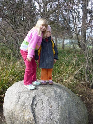 Keywords: brothers and sisters sisters children stone autumn climb cap joy smile rain jacket more park playground play nature cheerful joy of life