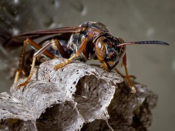 | Keywords: Brown Paper Wasp-27527-4.jpg A female Brown Paper Wasp Polistes fuscatus guarding her nest <br>Photo taken with an Olympus E-5 in Caldwell County NC USA <br>Cropping and post-processing performed with Adobe Lightroom http //www kenthomas us KenThomas us <br> personal website of photographer 2012-05-18 18 07-05 <sup>ISO 8601</sup> Ken Thomas This image is released to the public domain and therefore no permission or credit is required <br>Comments and/or feedback however are always welcome Please see my user page or http //kenthomas us my personal website for details and contact info Polistes fuscatus Taken with Olympus E-5 Caldwell County North Carolina |