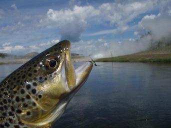 Keywords: BrownTroutandSoftHackleNymph.JPG Brown Trout having taken a soft-hackle nymph from the Firehole River Yellowstone National Park Released Mike Cline 2009-05-31 Mike Cline Wet fly patterns Salmo trutta Firehole River