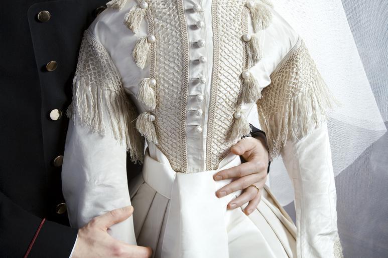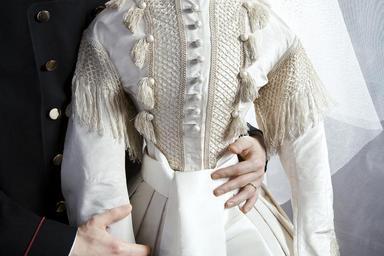 | Keywords: Brudklänning - Hallwylska museet - 86587.tif BRUDDRÄKT jämte sexton lösa föremål Bestående av klänning slöja krona krans och bukett näsduk strumpor strumpeband skor linne snörliv kalsonger nattröja nattmössa morgonmössa och tofflor Klänning Liv och kjol samt fyra lösa bandlängder till rosett Av vit sidenmoiré moiré antique med handknuten garnering av gulvitt silke Hand- och maskinsydd Liv Högt bestående av två framstycken två sidostycken och ett ryggstycke alla sneddade Knäppning framtill med kulformiga vita snörmakeriknappar samt knapphål nedanför dessa hakar och hyskor av vit metall isydda med kaststygn under en kantslå av vitt siden Ärmar halvlånga nedre kanten rak Liv och ärmar fodrade med vitt glansigt bomullstyg s k kambrik I sömmarna stöd av valfiskben Kjol Bestående av åtta raka våder baktill ett fållat sprund samt i högra framsömmen en avlång ficka av tyg som livfodret sömmarna maskinsydda Mått Liv längd omkring 41 cm ; bröstvidd omkring 50 cm ; halsvidd omkring 37 cm ; midjevidd omkring 54 cm Ärmar längd omkring 54 cm ; vidd omkring 32 cm Holkar längd omkring 18 cm ; vidd omkring 26 cm Bårder bredd omkring 4 6 5 och 7 cm Tofs längd omkring 5 5 cm Frans längd omkring 3 5 och 8 cm Kjol längd fram omkring 1 16 m ; bak omkring 1 77 m ; vidd omkring 5 48 m Linning längd omkring 64 cm ; bredd omkring 3 cm <br/><br/>Bandlängder <br/>Av vit sidenrips med satinkanter de två korta till öglor de två långa till ändar de senare på vardera ytterändan med garnering som på livet <br/><br/>Mått <br/>Längd 0 41 och 1 36 m ; bredd 18 cm<br/><br/>Anm <br/>Rosetten troligen från en senare modellförändring <br/><br/>Slöja <br/>Av vit silkestyll Rektangulär i två olika stora stycken <br/><br/>Mått <br/>Stora stycket längd omkring 2 32 m ; bredd omkring 1 65 m <br/>Lilla stycket längd omkring 1 68 m ; bredd omkring 1 56 m<br/><br/>Krona <br/>Rund Stommen bestående av åtta radiella byglar av mörk karkas nedtill fästa vid en horisontell liggande ring byglarnas övre ändar sammanlöpande upptill i mitten till en nedåtvänd kort spets samt virade med tätt sittande myrtenkvistar <br/><br/>Krans <br/>Med stomme som kronan samt omvirad med myrtenkvistar <br/><br/>Bukett <br/>Av myrten med rester av vita liljor <br/>Dessutom fragment av en liten bukett bestående av en ros samt gullborste Linosyris vulgaris eller Aster linosyris; användes på 1800-talet och ännu i början av 1900- talet som grönt i buketter o d <br/><br/>Näsduk <br/>Av vit linnebatist med bred vit spets application de Bruxelles <br/>Kvadratisk handsydd <br/>Spetsen knypplad samt sydd på maskinvävd tyll <br/>Spetsen fastsydd med efterstygn av vit tvåtrådig linnetråd vid ett mittstycke av vit linnebatist <br/><br/>Mått <br/>Sidlängd omkring 43 cm <br/><br/>Strumpor ett par <br/>Av vitt silke vävda <br/>På vardera smalbenets utsida en tät rand upptill med axliknande avslutning samt nedtill tvådelad med en lång rand på foten och en kortare på hälen <br/>Upptill en bred fåll på utsidan med två par parallella smala ljusröda ränder <br/><br/>Mått <br/>Längd omkring 79 cm ; vidd omkring 22 5 cm <br/><br/>Strumpeband ett par <br/>Handsydda Av ljust rödgredelint sidentaftband varpå pålagt ett mittparti av vitt sidentaftband med stadkanterna omvikta och fastsydda med fållstygn av ljust rödgredelint silke <br/>Bandens ändar trubbvinkligt urklippta <br/><br/>Mått <br/>Längd omkring 1 m ; mittparti längd 25 cm <br/>Band bredd omkring 2 5 cm <br/><br/>Skor sedermera s k pumps ett par <br/>Av vit sidenatlas <br/>Hand- och vändsydda <br/>På vardera sidan på mitten två snett tvärgående efterstygnssömmar s k sidosömmar av vitt silke <br/>Knytband av vita smala tvåskaftade sidentaftband <br/>Bakstycket fodrat med vitt getskinn framstycket med vitt tvåskaftat linnetyg <br/>Sula av tunt ljusbrunt läder med tvärskuren tå Fodersula av vitt getskinn <br/>Klack av trä halvhög svagt insvängd klädd med vit sidenatlas samt med ytterlapp av ljusbrunt läder fäst med sex stift av mässing <br/><br/>Mått <br/>Längd omkring 24 cm ; bredd omkring 6 2 cm<br/>Klack höjd omkring 3 cm <br/>Knytband längd omkring 52 cm ; bredd 0 8 cm <br/><br/>Linne <br/>Av vitt tvåskaftat linnetyg samt med broderier <br/>Hand- och maskinsytt <br/>Fram- och bakstycke sneddade samt hopsydda med fällsömmar <br/>Ärmhålen starkt sneddade uppåt ärmarna korta med kilar <br/>Halsurringningen svagt rundad samt tätt rynkad <br/>Alla sömmar sydda med fin vit bomullstråd <br/><br/>Mått <br/>Längd omkring 1 07 m ; vidd nedtill 1 8 m <br/>Ärmar längd omkring 7 8 cm ; vidd omkring 36 cm <br/>Halslinning längd omkring 93 cm ; bredd omkring 0 8 cm <br/><br/>Snörliv <br/>Av vitt fyrskaftat bomullstyg och vitt tvåskaftat linnetyg <br/>Handsytt <br/>Två symmetriska sneddade stycken hopsydda framtill i mitten och bildande en lång spets Nedtill på vardera sidan om denna fyra kilar en tresidig och tre fyrsidiga upptill två starkt sneddade tresidiga kilar Mellan kilarna ett stöd av valfiskben utanför bortre kilen sex dylika stöd <br/>Sömmarna sydda dels med vitt silke dels med vit bomullstråd <br/><br/>Mått <br/>Höjd fram omkring 35 5 cm ; bak omkring 35 cm <br/>Midjevidd omkring 46 cm <br/><br/>Kalsonger s k öppna ett par <br/>Av vitt smalrandigt fyrskaftat bomullstyg samt med broderi <br/>Handsydda och handbroderade <br/>Bestående av två fram- och baktill sneddade stycken på framsidan hopsydda ett stycke upptill med fällsöm <br/>Alla sömmar sydda med vit fin bomullstråd <br/>Mått <br/>Längd omkring 84 cm ; linning längd omkring 94 cm <br/>Ben vidd nedtill omkring 56 cm ; band längd omkring 83 cm <br/><br/>Underkjol <br/>Av vitt tvåskaftat bomullstyg samt med broderi <br/>Hand- och maskinsydd <br/>Bestående av fem raka våder upptill tätt rynkad runtomkring samt fastsydd med fållstygn vid en sneddad linning med dragsko <br/>Alla s