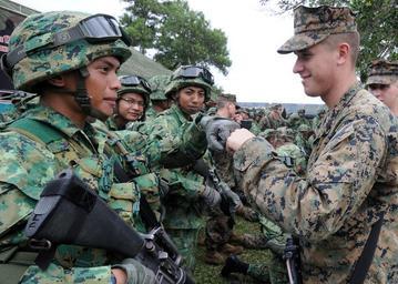 | Keywords: Brunei and US forces in CARAT 2011.jpg en U S Marine Corps Lance Cpl Richard Hooper right assigned to Fleet Antiterrorism Security Team Pacific says goodbye to a Bruneian land forces soldier following military operations on urban terrain training in support of Cooperation Afloat Readiness and Training CARAT Brunei 2011 in Seria Brunei Oct 6 2011 CARAT is a series of bilateral exercises held annually in Southeast Asia to strengthen relationships and to enhance force readiness 2011-10-06 11 23 47 http //www defenseimagery mil/imagery html a search s brunei 20military chk 6cfe0 n 90 guid ef74cd5757aa55c15c943fb1fc4c06289250a168 Mass Communication Specialist 2nd Class Jessica United States Navy PD-USGov-Military-Navy Uploaded with UploadWizard Army of Brunei Cooperation Afloat Readiness and Training 2011 Military camouflage clothing Males with M16 rifle |