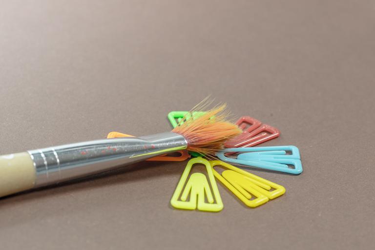 Keywords: brush paint colorful art color watercolour painting watercolour painting watercolor painter draw image artwork hair brush still life brush bristles office brush hair paper clips tacks macro datailaufnahme close macro photo stationery items mess clip office accessories