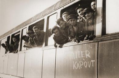 | Keywords: Buchenwald Children 26149.jpg Jewish youth liberated at Buchenwald lean out the windows of a train as it pulls away from the station The train which has been marked with the phrase Hitler kaput Hitler is finished will transport the children to an OSE Oeuvre de Secours aux Enfants home in Ecouis France Romek Wajsman now Robert Waisman is the son of Rywka Gil and Chiel Wajsman He was born on February 2 1930 in Skarzysko Poland where his father worked as a tailor Romek had five older siblings Chaim Mottel Moishe Abram and Lea The Wajsman family was forced into the local ghetto in the fall of 1941 Romek's older brothers were sent to work in the HASAG factory camp in Skarzysko Chaim obtained information about the planned liquidation of the Skarzysko ghetto shortly before it was to occur In the early morning hours of the appointed day Chaim entered the ghetto and smuggled Romek out in the back of a truck Chaim managed to obtain a permit for Romek to work with his brothers at the HASAG plant marking aircraft shells with the factory's initials With the advance of the Red Army in the summer of 1944 the HASAG camp was closed and Romek was sent to dig anti-tank ditches in Przedborz Subsequently he was transfered to the HASAG camp in Czestochowa He remained there for several months before being sent to Buchenwald Romek was liberated in Buchenwald on April 11 1945 Shortly afterwards representatives of the OSE Oeuvre de Secours aux Enfants came to the camp and arranged for the transport of 430 Jewish children Romek among them to an OSE children's home in Ecouis France Romek was transferred from Ecouis to the OSE home at Le Vesinet near Paris In 1948 he and twenty other OSE children immigrated to Canada with the help of the Canadian Jewish Congress Romek and his sister Lea were the only members of the family to survive the war The Buchenwald children were a group of approximately 1000 Jewish child survivors found by American troops when they liberated the Buchenwald concentration camp on April 11 1945 Most of the children were originally from Poland though others came from Hungary Slovenia and Ruthenia Unsure of what to do with the child survivors American army chaplains Rabbi Herschel Schacter and Rabbi Robert Marcus contacted the offices of the OSE Oeuvre de Secours aux Enfants Jewish children's relief organization in Geneva They arranged to send 427 of the children to France 280 to Switzerland and 250 to England Vivette Samuels reverses the figures for England and Switzerland in her monograph Sauver les Enfants On June 2 1945 OSE representatives arrived in Buchenwald and together with Rabbi Marcus escorted the transport of children to France Rabbi Schacter accompanied the second transport to Switzerland Because of the difficulty in finding clothing for the children the boys were clad in Hitler Youth uniforms This created a problem for when the train crossed into France it was greeted by an angry populace who assumed the train was carrying Nazi youth Thereafter the words KZ Buchenwald orphans were painted on the outside of the train to avoid confusion On June 6 1945 the French transport arrived at the Andelys station and the orphans were taken to a children's home in Ecouis Eure The home had been set up to accommodate young children but in fact only 30 of the boys were below the age of 13 This was only one of the many problems faced by the OSE personnel who were not prepared to handle a large group of demanding rebellious teenagers who were full of anger for what they had experienced At Ecouis the boys were given medical care counseling and schooling until more permanent accommodations could be found Most of the children remained only four to eight weeks at Ecouis before being moved elsewhere and the home was closed in August 1945 Among the first to leave were a group of 173 children who had family in Palestine They were given immigration certificates and departed from Marseilles in July aboard the British vessel the RMS Mataroa The remaining boys at Ecouis were soon transferred to other residences and homes Some of the older ones were sent to the Foyer d'Etudiants located on the rue Rollin in Paris where they boarded while attending vocational training courses or working at jobs in the city Others were sent to the Chateau de Boucicaut home in Fontenay-aux-Roses Hauts-de-Seine Many of the boys came from religiously observant homes Since the OSE could not obtain kosher food for everyone they divided the children into religious and non-religious groups Dr Charly Merzbach offered OSE the use of his estate the Chateau d'Ambloy Loir-et-Cher for the summer and between 90 and 100 boys chose to go there in order to receive kosher food and live in a religious environment In October 1945 the children and staff of Ambloy were relocated to the Chateau de Vaucelles in Taverny Val d'Oise About 50 of the non-religious boys were taken to the Villa Concordiale in Le Vesinet Yvelines near Paris that housed an equal number of French Jewish orphans In the summer they went to the Foyer de Champigny in Champigny-sur-Marne Val-de-Marne In all the homes attended by the Buchenwald children vocational training as well as regular classroom instruction was offered At the same time OSE social workers made every effort to locate surviving relatives succeeding in about half the cases By the end of 1948 all of the Buchenwald children who had come to France had left the OSE fold and begun new lives for themselves Sources Hemmendinger Judith and Krell Robert The Children of Buchenwald Gefen Publishers 2000; Grobman Alex Rekindling the Flame Wayne State University Press 1993; Hazan Katy Chronologie de l'histoire de l'OSE L'action de l'OSE apres la guerre 31 December 2002 Buchenwald Thuringia Germany June 1945 http //www ushmm org/ United States Holocaust Memorial Museum courtesy of Willy Fogel PD-USGov Buchenwald children Images from the United States Holocaust Memorial Museum Crowded trains HASAG |