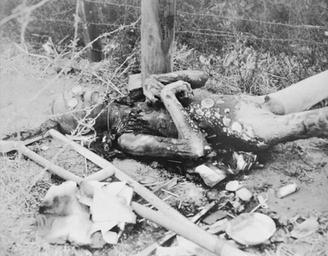 | Keywords: Buchenwald Leipzig-Thekla Corpse 4.jpg A burned corpse found at the base of the barbed wire fence in Leipzig-Thekla a sub-camp of Buchenwald Leipzig-Thekla Germany Apr 19 1945 - May 1945 http //www ushmm org/ United States Holocaust Memorial Museum courtesy of National Archives and Records Administration College Park PD-USGov Holocaust victims People and barbed wire Buchenwald Leipzig-Thekla concentration camp Images from the United States Holocaust Memorial Museum Human corpses | ||||