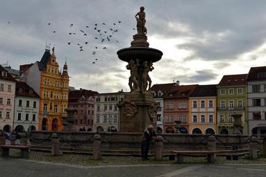 Keywords: budějovice city bohemia south bohemia architecture building square fountain birds heaven contrast clouds movement city center person