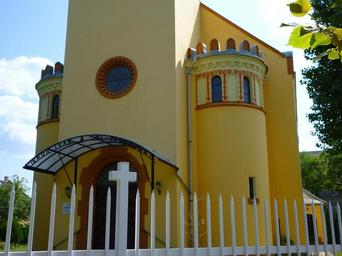 Keywords: budapest hungary church fence cross rook facade yellow white blue sky wood foliage