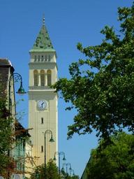 Keywords: budapest hungary wekerle battery church chandelier wood tower tower clock blue sky
