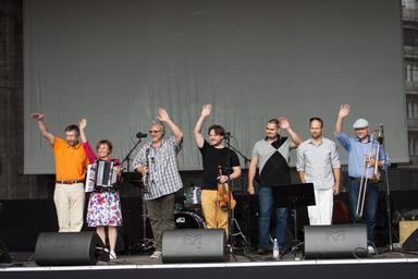 Keywords: Budapest Klezmer Band-3.jpg Budapest Klezmer Band at the open-air production in front of the Örkény Theatre A Budapest Klezmer Band az Örkény-kert rendezvényen Photo by Szilas 2014-08-30 Szilas Commonist Budapest Klezmer Band