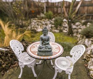 Keywords: buddha statue panorama wide buddha religion buddhism culture religious statue garden table chairs brenizer bokehrama