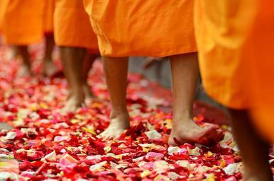 Keywords: buddhism monks buddhists walk rose petals orange robes thailand thai asia religion wat phra dhammakaya temple dhammakaya pagoda more than million budhas gold