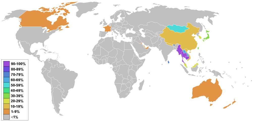 | Keywords: Buddhism percentage by country.png Percentage of Buddhists by country data from http //www pewforum org/files/2014/01/global-religion-full pdf Pew Research Center Global Religious Landscape 2010 and most recent census reports Author Vexorg Various modifiers 2007-09-18 own assumed Nyo~commonswiki map Original upload log page en wikipedia Buddhism_percentage_by_country png 2011-02-11 01 25 Greenrenegade 1365×638× 51704 bytes <nowiki>Reverted to version as of 21 55 24 February 2008 as most precisely shows global distribution of Buddhism </nowiki> 2008-02-24 23 50 Angelo De La Paz 1365×638× 32933 bytes <nowiki>Reverted to version as of 17 01 28 June 2007 RV to the last version by Vexorg</nowiki> 2008-02-24 21 55 Saimdusan 1365×638× 51704 bytes <nowiki>Added 1-9 and >1 makes the map more accurate </nowiki> 2008-02-24 21 38 Saimdusan 1365×638× 51195 bytes <nowiki>I fixed it with recent information from the Wikipedia pages </nowiki> 2007-06-28 17 01 Vexorg 1365×638× 32933 bytes <nowiki>Buddhism_percentage_by_country png</nowiki> 2007-06-25 20 12 Vexorg 1365×638× 32932 bytes <nowiki>Buddhism_percentage_by_country</nowiki> Buddhism distribution maps of the world |
