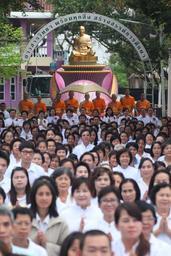 Keywords: buddhists people march monks orange robes ceremony convention meeting peace tradition thailand bangkok belief walk wat phra dhammakaya temple dhammakaya pagoda more than million budhas gold buddhism