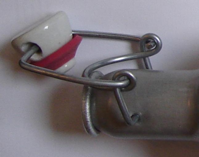 Keywords: Bügelflaschen swingtop mechanism closeup.jpg closeup of a Bügelflaschen swing top bottles mechanism showing porcelain stopper and rubber washer ;Source own photograph ;Photographer User Wikibob ;Camera Sony Cybershot ;Usage restrictions none Copyrighted free use Washers hardware Swing-top closures Unidentified beverage bottles |