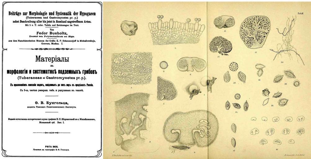 | Keywords: Buholz1902.jpg  ru Ф В Бухгольц  ате иалы к мо фологии и систематике подземных г ибов Титульный лист и таблица  исунков de F Bucholtz Beiträge zur Morphologie und Systematik der Hypogaeen 1902 scanned book F Bucholtz A Bondartsev PD-RusEmpire Uploaded with UploadWizard Botany book covers single pages etc |