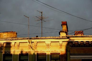 Keywords: building apartment suburban detail ornate sunlight last light cream and terracotta cables antennas sky grey