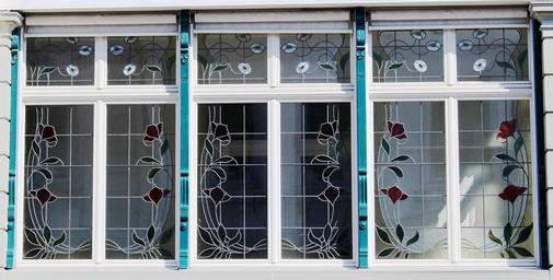 Keywords: building art nouveau window glass decorated window sprouted cross sprouted flowers decorated mirroring