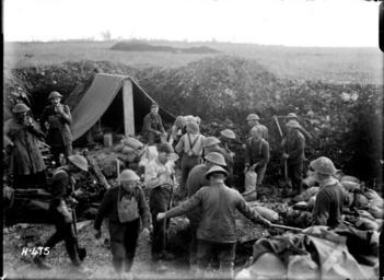 | Keywords: blackandwhite monochrome outdoor people black and white New Zealand soldiers working to set up a battalion headquarters near the front line. Shows sand bags being filled as the troops dig in and fortify their position. Photograph taken Courcelles 6 April 1918 by Henry Armytage Sanders. Inscriptions: Inscribed - Photographer's title on negative -bottom left: H475. Quantity: 1 b&w original negative(s). Physical Description: Dry plate glass negative 4.75 x 6.5 inches Building a battalion headquarters during World War I, Courcelles. Royal New Zealand Returned and Services' Association :New Zealand official negatives, World War 1914-1918. Ref: 1/2-013093-G. Alexander Turnbull Library, Wellington, New Zealand. natlib.govt.nz/records/22727467 New Zealand soldiers working to set up a battalion headquarters near the front line. Shows sand bags being filled as the troops dig in and fortify their position. Photograph taken Courcelles 6 April 1918 by Henry Armytage Sanders. Inscriptions: Inscribed - Photographer's title on negative -bottom left: H475. Quantity: 1 b&w original negative(s). Physical Description: Dry plate glass negative 4.75 x 6.5 inches Building a battalion headquarters during World War I, Courcelles. Royal New Zealand Returned and Services' Association :New Zealand official negatives, World War 1914-1918. Ref: 1/2-013093-G. Alexander Turnbull Library, Wellington, New Zealand. natlib.govt.nz/records/22727467 |