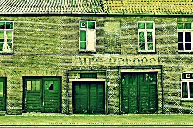 Keywords: building garage home doors window green bricks stone built house sidewalk away village brick tile roof discs mirroring broken go to waste old effect mystical spooky creepy
