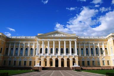 Keywords: building historic light yellow pillars white facade relief work arched windows symmetry sky blue