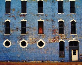 Keywords: building old weathered rustic blue windows exterior structure aged retro urban wall brick masonry damaged grungy vintage