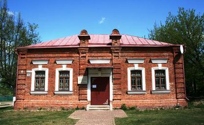 Keywords: building red brick rectangular roof slanted windows frames white door architecture grass trees sky